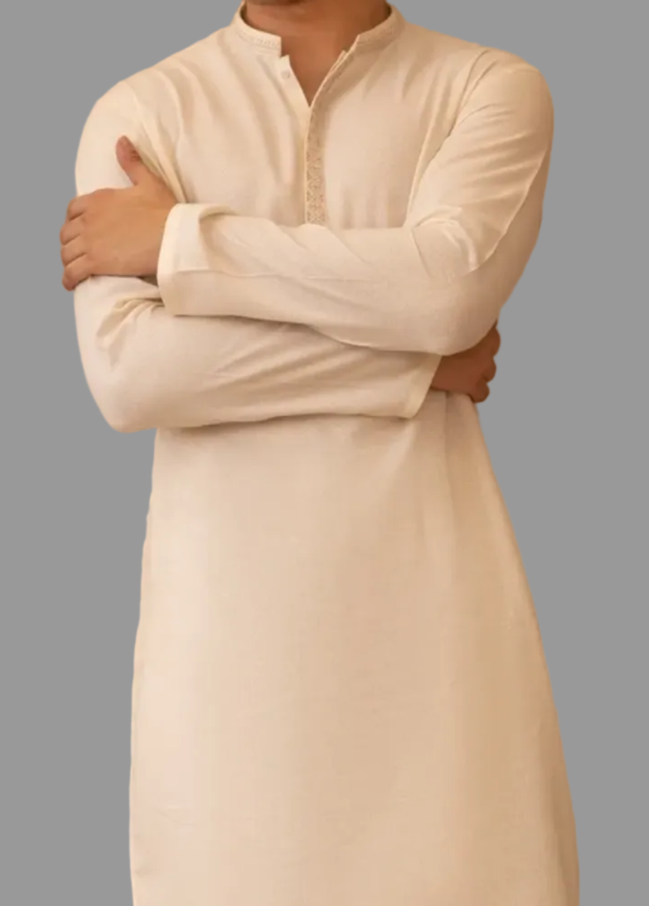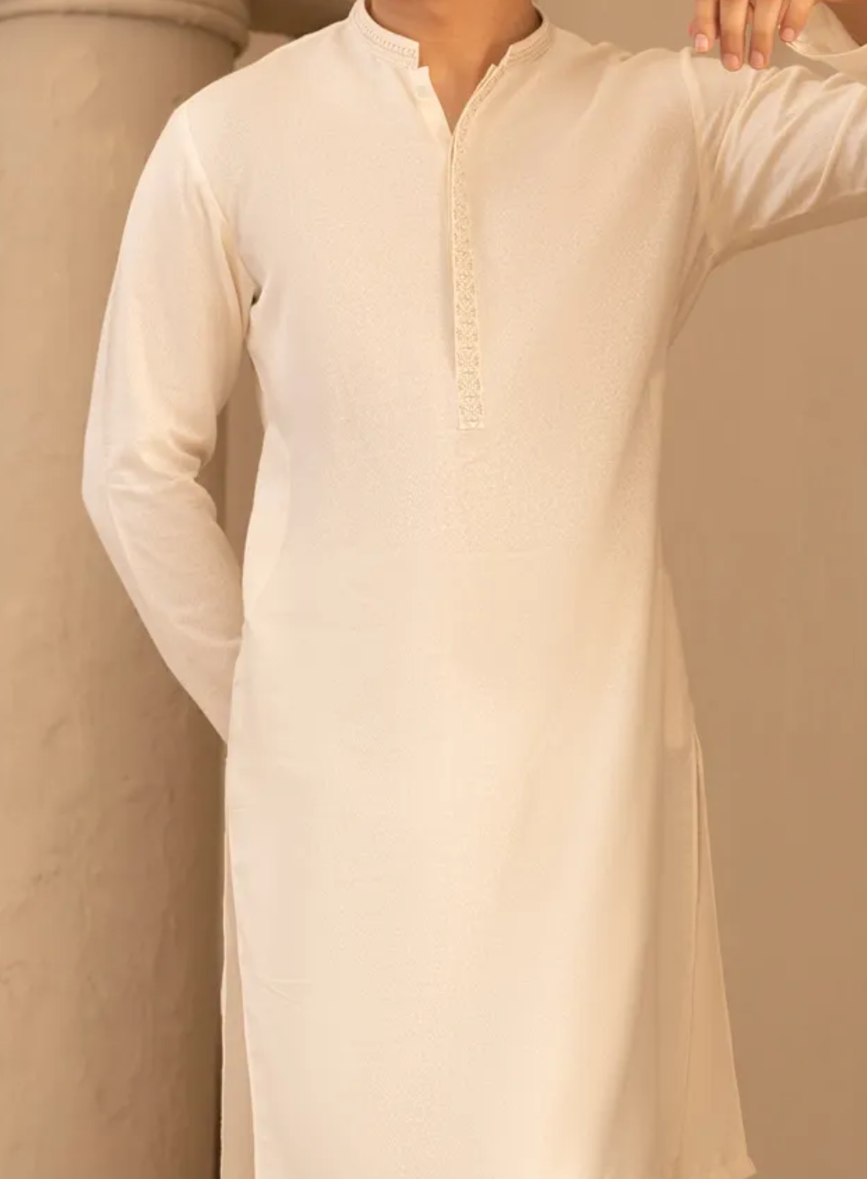 Designed with the young gentleman in mind, this cream ayudia formal kameez shalwar exudes charm and sophistication. Its classic yet stylish look offers versatility, perfect for both casual and formal occasions.