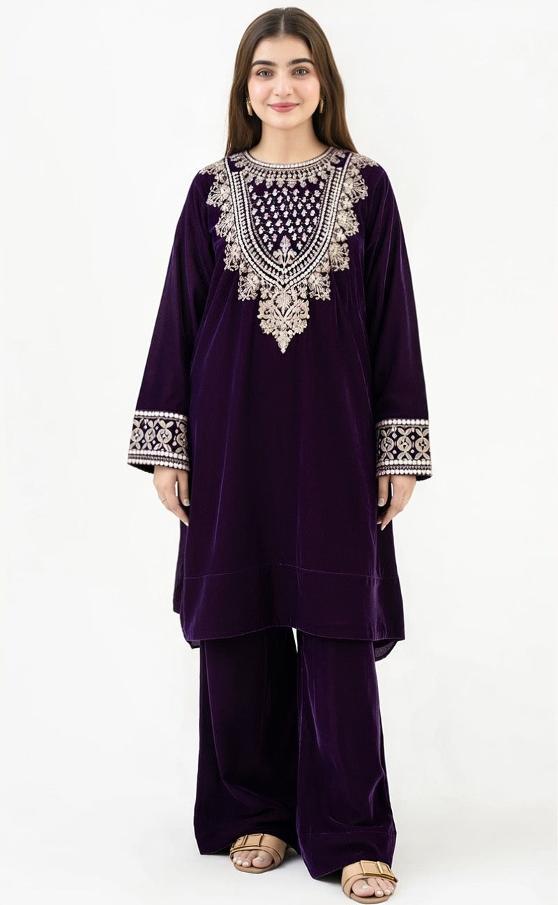 This luxurious 3Pc velvet outfit by Limelight is a perfect blend of timeless elegance and refined craftsmanship. Designed for festive and formal occasions, it offers a rich, graceful silhouette with intricate detailing.