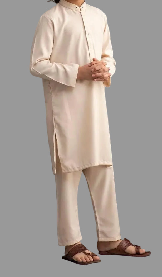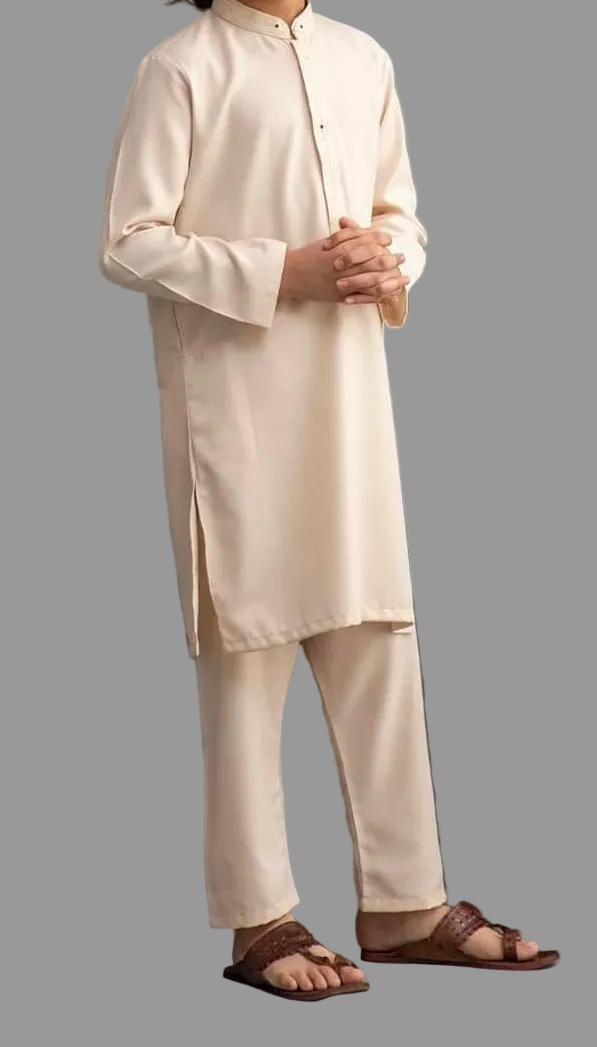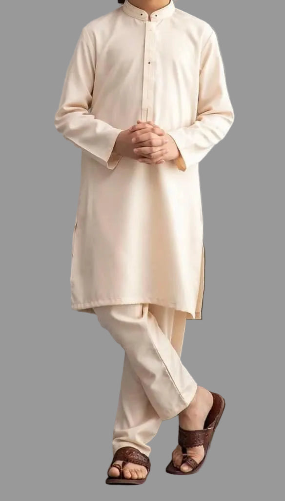 A soft, elegant creamy white kameez shalwar for boys by MTJ, designed for a clean, graceful, and classic look. Perfect for Eid, family events, or formal gatherings. The colour and cut give a very neat, angelic appearance—ideal for kids.