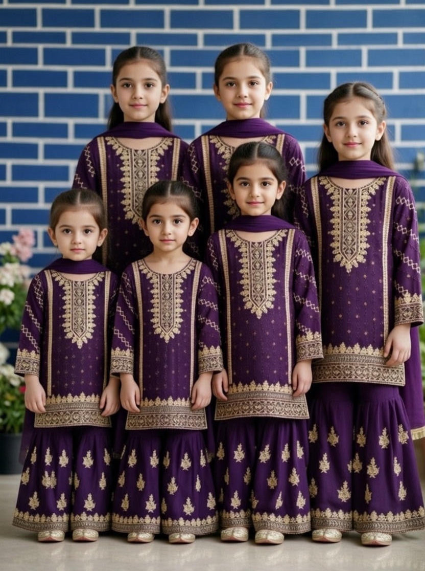 This is a beautiful 3-piece ethnic sharara set designed for girls, perfect for festive occasions, weddings, Eid, or family celebrations. The outfit features a rich purple (deep violet/plum) colour with intricate gold embroidery, giving it a royal and elegant look.