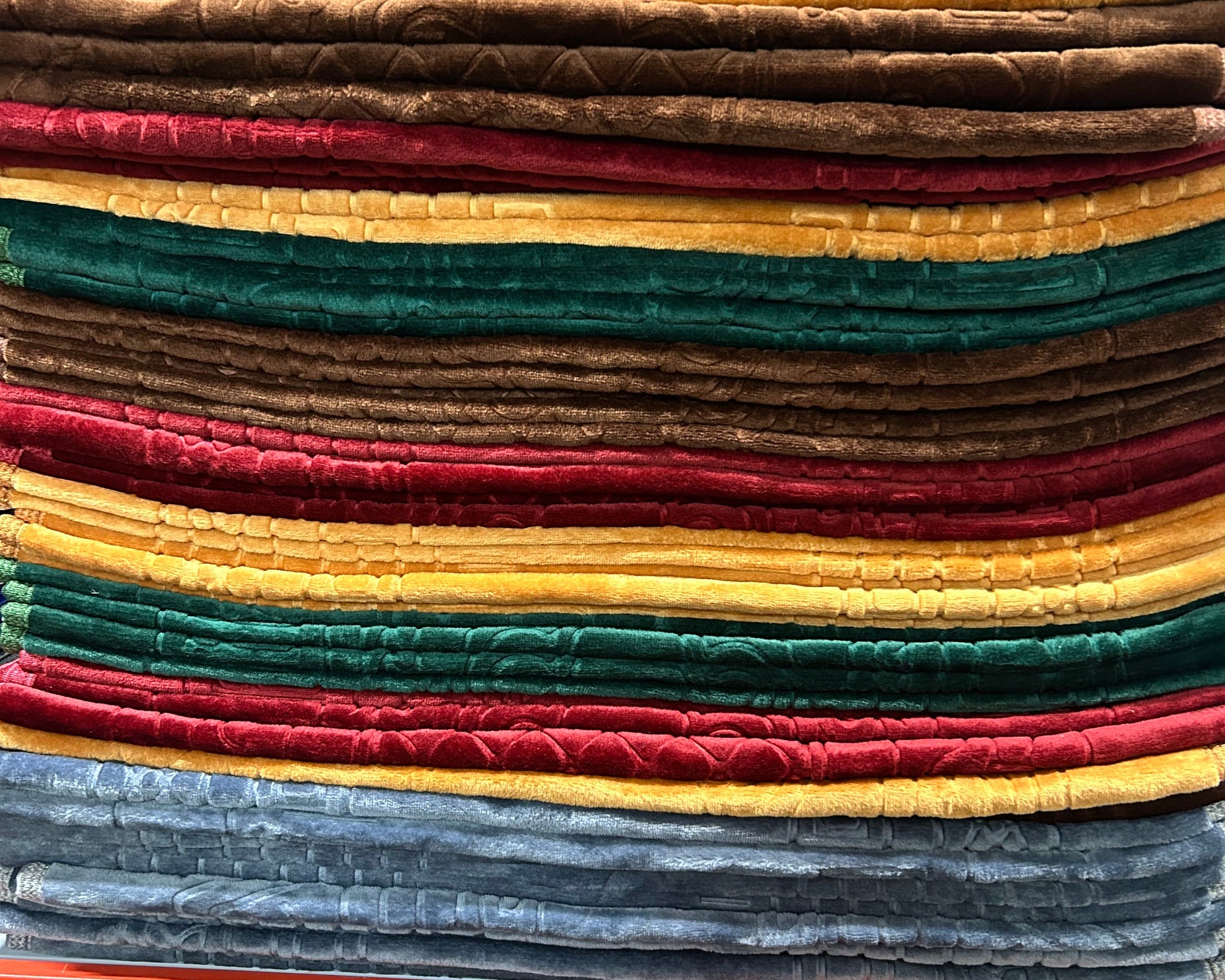 This prayer mat is made from a thick, velvety material that is incredibly soft underfoot and comfortable to kneel and prostrate on. The deep pile suggests excellent cushioning.