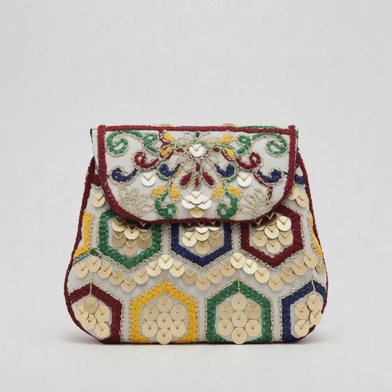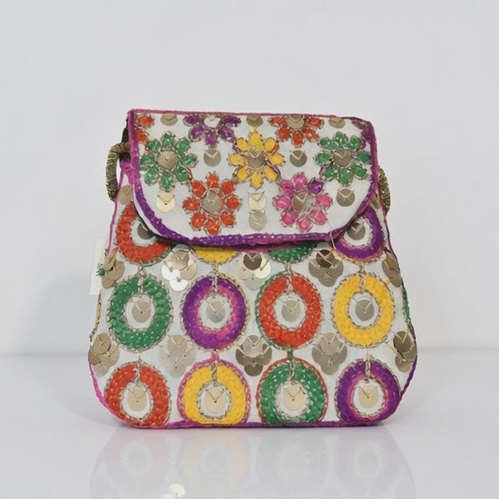 This adorable kids’ purse is a vibrant, traditional-inspired accessory featuring intricate embroidery and colourful mirror-like sequins in bold patterns on a rich golden base.