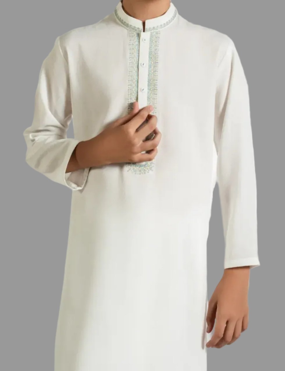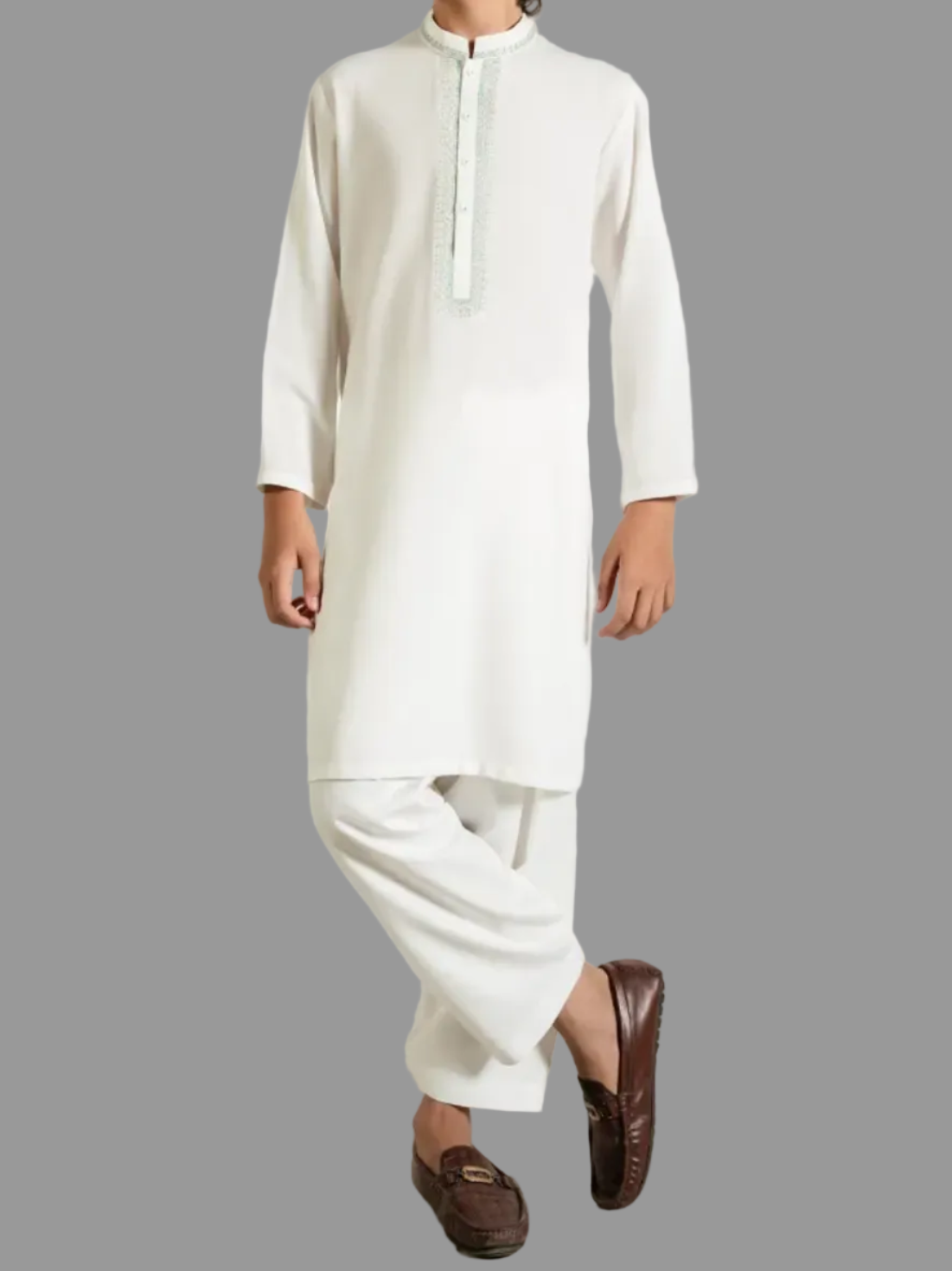 A comfortable and classic Off White Blended Kameez Shalwar made for little boys. Easy to wear and perfect for everyday use. Neat stitching and a smart look keep your child looking tidy and well-dressed.