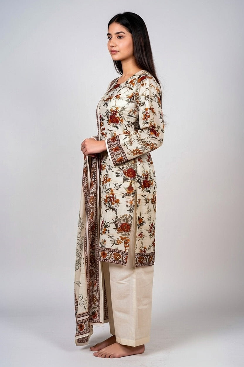 The kameez (tunic/top) is crafted from luxurious khaddar fabric—a beautifully textured, warm cotton-wool blend that’s soft against the skin and ideal for cooler weather, providing cozy comfort without bulk. The soft off-white base is beautifully adorned with a vibrant yet delicate all-over floral print featuring clusters of blooming roses, sunflowers, and assorted blossoms in rich rust orange, reddish-brown, terracotta, and muted gold/earthy tones, accented by subtle grayish-black outlines and stems for a hand-block or traditional kalamkari-inspired aesthetic. This creates a cheerful, nature-inspired motif that’s lively against the neutral ground. The neckline is a simple, flattering round or scoop style, paired with full-length sleeves finished with intricate border detailing in matching rust-brown floral and geometric patterns. A coordinating hem border adds polished elegance with repeating motifs and fine lines. Designed in a short-length style, it offers a modern, contemporary silhouette—falling gracefully to mid-thigh or just above the knee—with side slits for ease of movement and a modest, flattering fit.