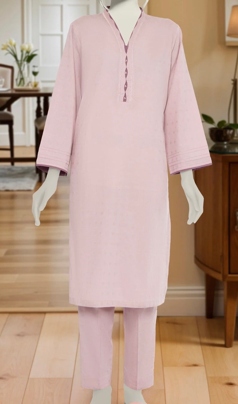 This elegant 3-piece outfit by M.T.J features a beautifully crafted design in a soft Tea Pink shade. The shirt is made from premium Jacquard fabric, showcasing a subtle woven texture that adds depth and refinement to the overall look. It is paired with a Dyed Cambric trouser, offering comfort and structure while maintaining a graceful silhouette.