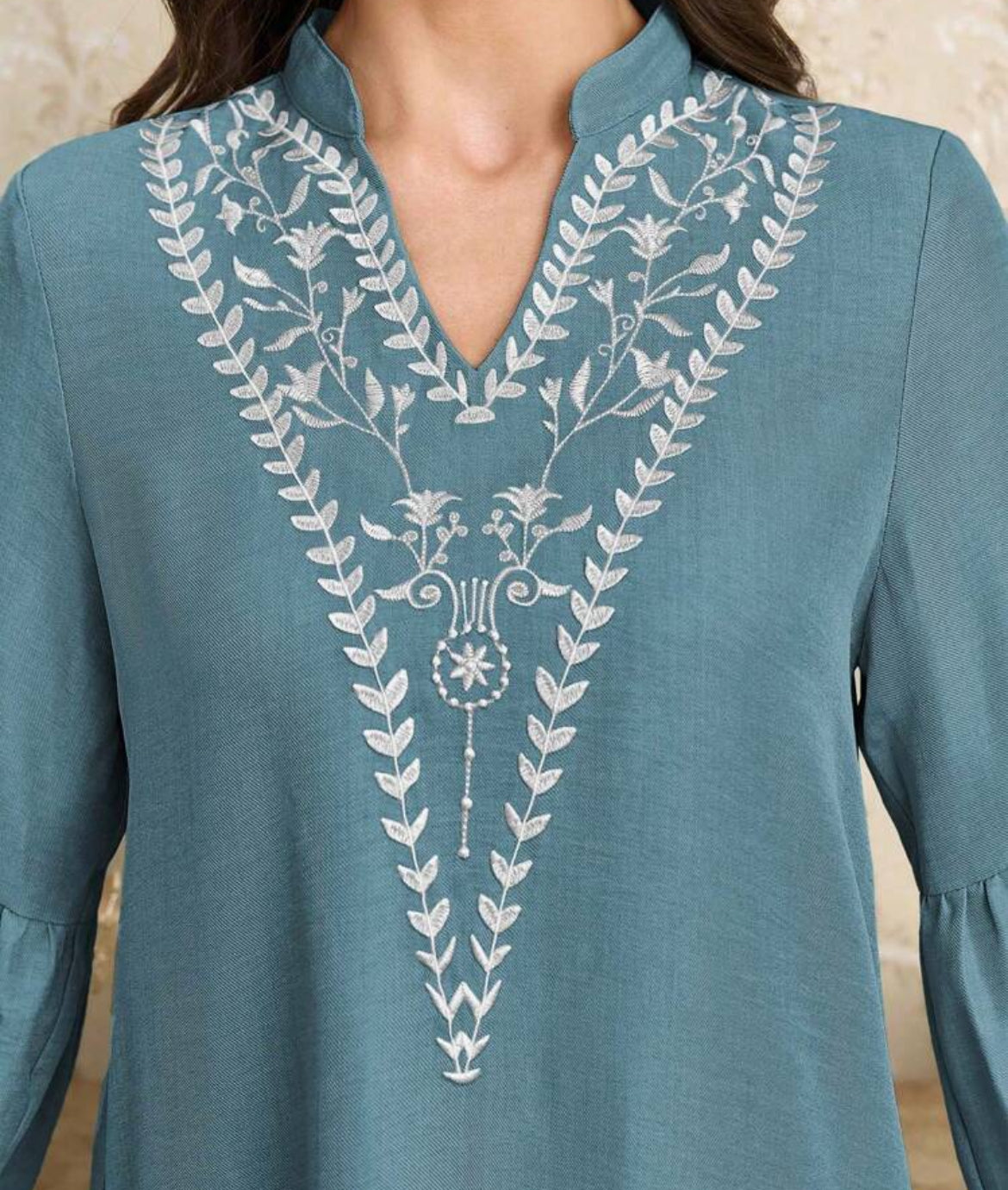 Embroidered V-Neck With Stand Collar.