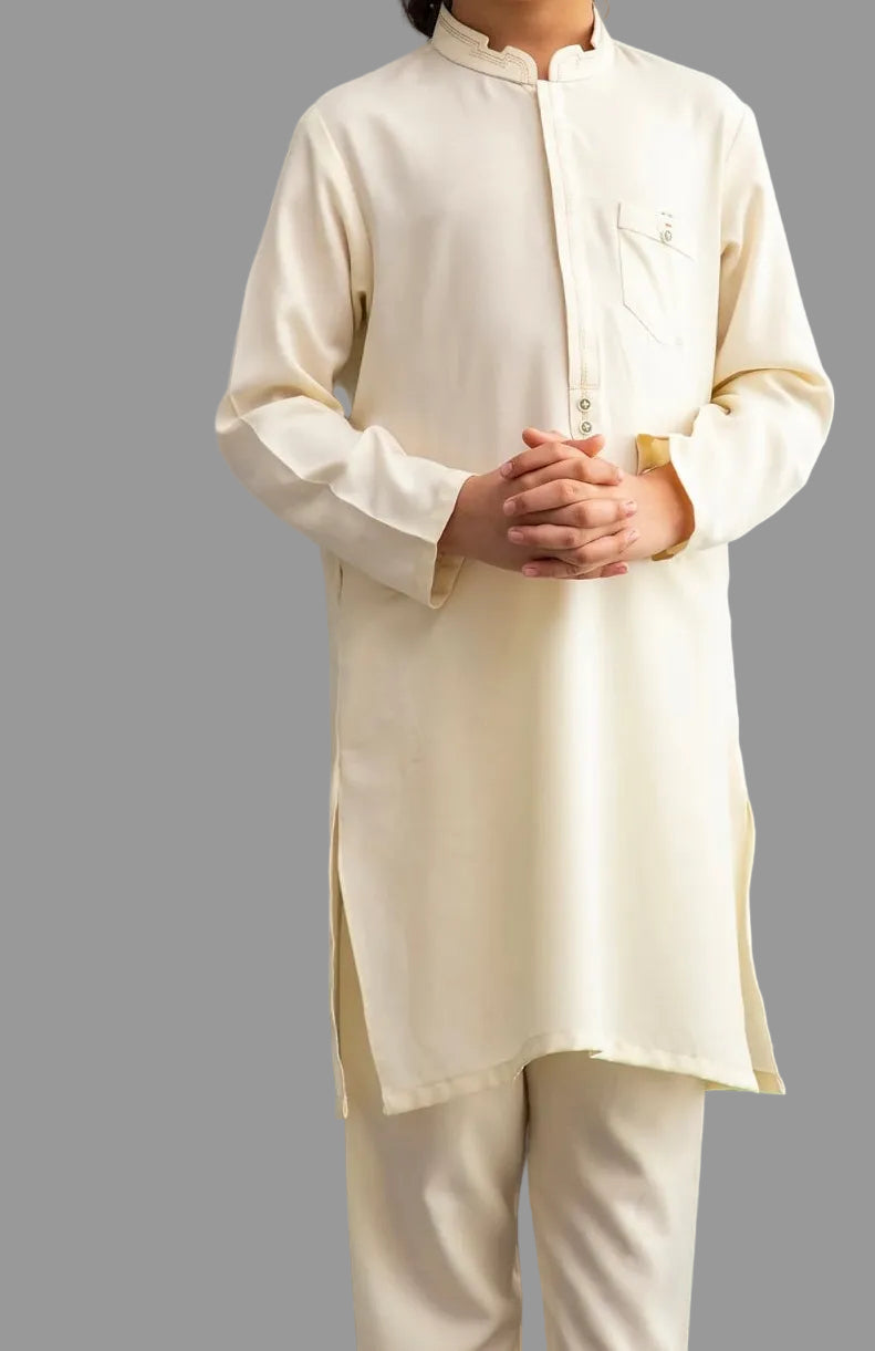 This outfit is a soft off-white kameez shalwar designed especially for young boys. The look is clean, elegant, and traditional—perfect for formal events, Eid, or family gathering.This outfit gives a graceful, simple, and pure Eastern wear feel. The off-white tone makes it look Clean, Elegant, Photogenic, Suitable for both day & evening events.