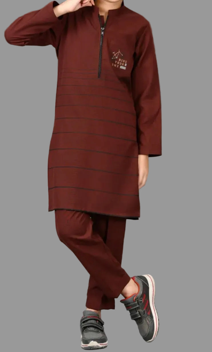 A stylish and modern rust brown kameez shalwar for boys by J., designed to give a trendy yet traditional look. This outfit blends casual comfort with a sporty design, making it perfect for daily wear, Culture Events.