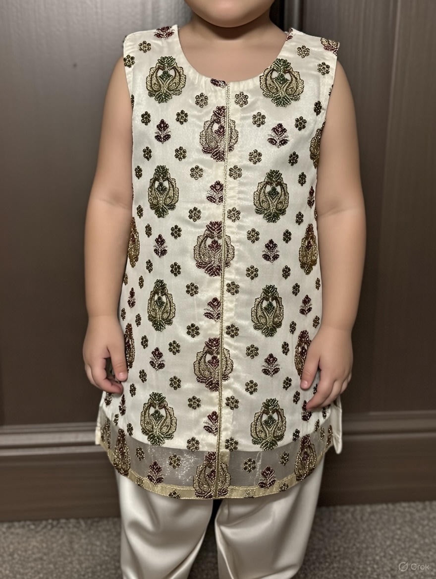 This adorable baby girl outfit is a traditional ethnic ensemble. A two-piece set consisting of a sleeveless kurti paired with straight-leg pajamas (trousers). The top has a high round or halter neckline, front button or hook closure and an A-line silhouette for comfort and ease of movement.